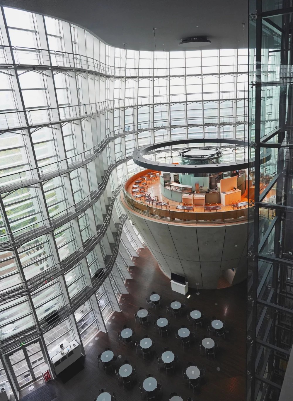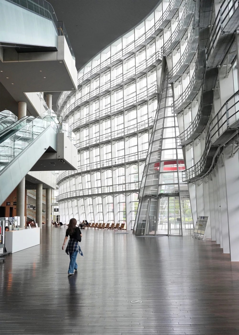 國立新美術館建築設計出自名望極高的黑川紀章之手,是電影《你的名字》取景地。館內有兩個非常炫酷的倒錐型建築,像極了科幻電影裡巨大飛船的引擎。