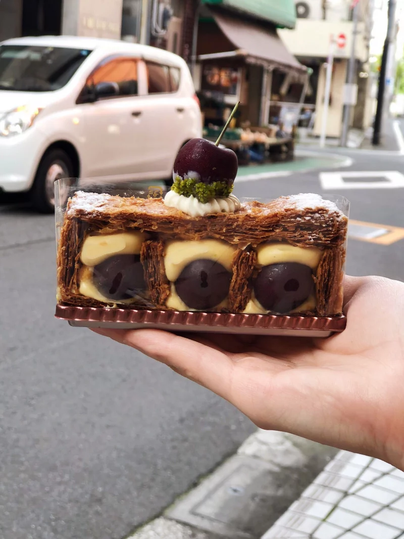 她家的千層派(拿破崙、mille-feuille)也是非常用心,不是常規的三層組合,還是改成了豎排列方式,大家都知道網上關於“怎麼優雅的吃千層派”的帖子非常多,千層派非常難切,極其酥脆,很難吃的優雅,而這款設計將千層派做成小塊的,至少可以將優雅度提升50%。現熬卡仕達也是千層派的標配,國內迷戀c***gdj千層派的,一定不知道還有卡仕達奶油這麼一說吧。裡面的夾心水果也隨季節變化,櫻桃、草莓、葡萄、栗子,看著非常有食慾。